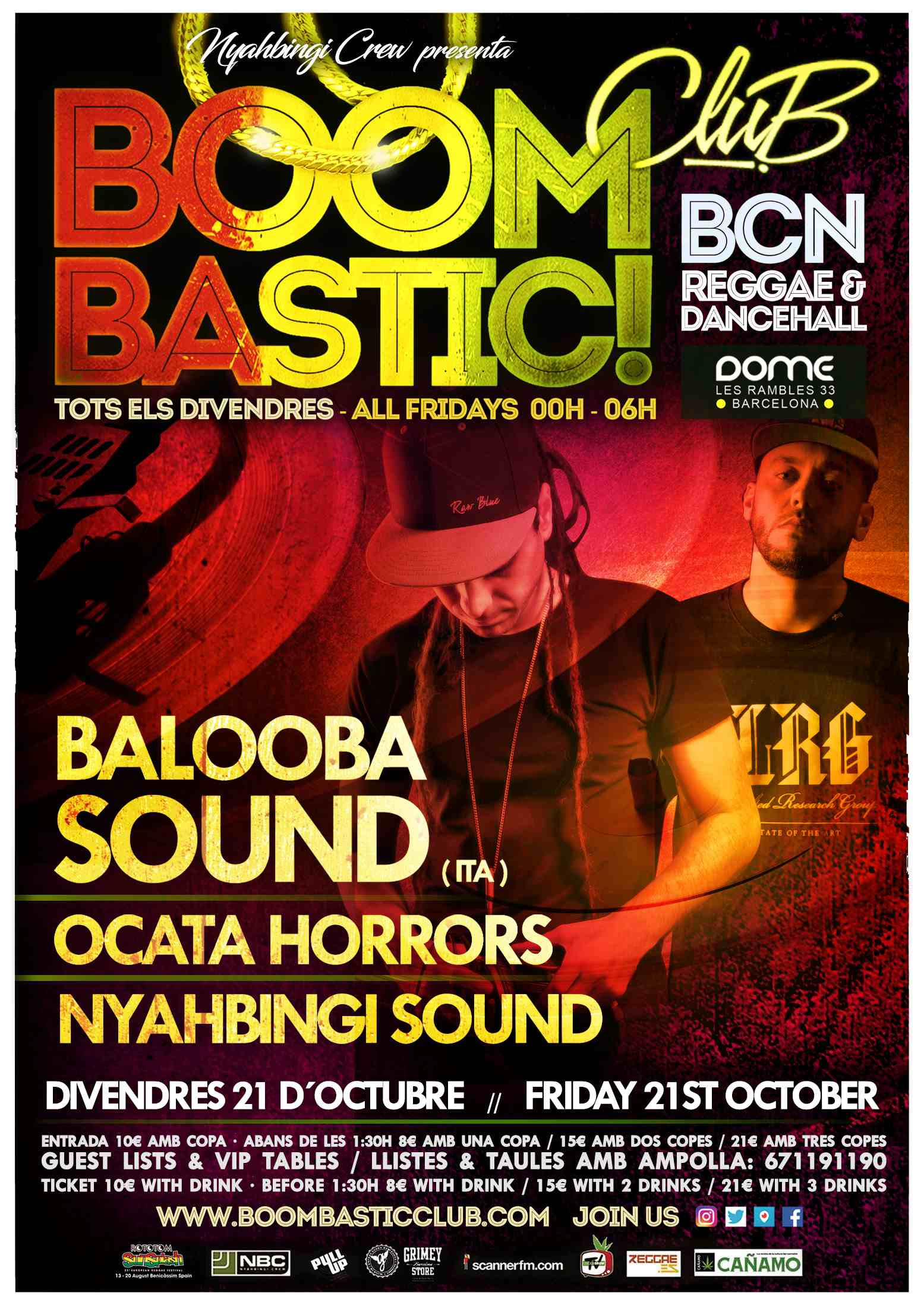 Fundado en Pescara en 2002, Balooba Sound es uno de los sounds más en forma de Italia. New roots y new dancehall en formato jugglin con aderezos de hip-hop, r’n’b, soca y una buena selección de dubplates es lo que se puede disfrutar en sus shows en directo. Con actuaciones en toda Europa, Balooba Sound han trabajado y colaborado con artistas de la talla de Luciano, Turbulence, Bitty McLean, Junior Kelly, Beenie Man, Capleton o Morgan Heritage; han participado en numerosos sound clash; tienen dos programas de radio: Connect Radio Show en Irie Vibes Radio (Detroit) y Balooba’s Monthly Charts en Spinz FM (Brooklin, NY); y colaboran con marcas internacionales como NEFF o LRG Clothing. Unos auténticos killers de las pistas de baile que aterrizarán en BoomBastic Club el próximo 21 de octubre!