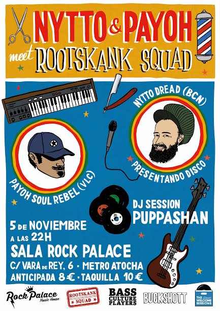 Nytto dread presenta su nuevo trabajo “Nytto Dread meets Bassculture Players” producido mano a mano con Puppa Shan, referente en la producción nacional de roots reggae. Nytto visita por primera vez Madrid, en una noche especial en la que se encontrará sobre el escenario con el artista afincado en Valencia Payoh Soul Rebel, estandarte de la raíz más soul del reggae. Para ello contarán con Rootskank Squad, backing band de nuevo cuño que reúne a músicos de Blueskank y otras formaciones, nacida este mismo año para acompañar a Michael Prophet en La Concha Reggae Fest. Para terminar, la fiesta durará hasta la madrugada cabalgando sobre la sesión dePuppa Shan (Bassculture Players).