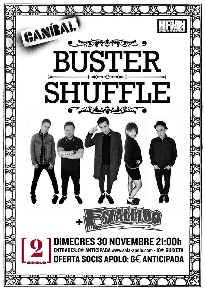Mañana nos visitan los londinenses Buster Shuffle en el comienzo de lo que será su gira por el estado, que recorrerá las localidades de Barcelona (Sala [2] Apolo), Madrid (Gruta 77), Alsasua (Gaztetxe) y La Bisbal ( l´Alternativa) los días 30 de Noviembre y 1, 2 y 3 de Diciembre Respectivamente.