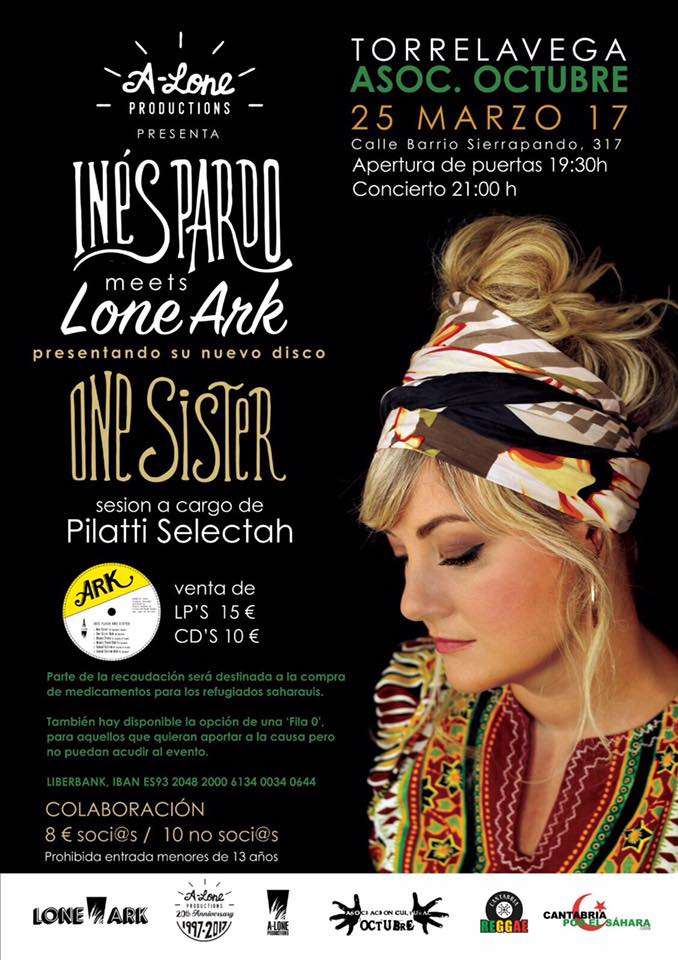 Durante este año de aniversario Lone Ark cuenta con la colaboración de Inés Pardo, y no es casualidad, ya que la vocalista cántabra presenta su primer trabajo discográfico de larga duración en combinación con Roberto Sánchez. Este solido trabajo que lleva por título “One Sister” confirma la excelente calidad vocal que Inés Pardo lleva desarrollando durante años en los escenarios de todo el país y también en el extranjero. Inés Pardo cuenta ya con una dilatada carrera dentro de la escena reggae nacional como corroboran todos directos y trabajos discográficos para grupos como Akatz o sellos como Roots&Fyah. Con su primer disco Inés nos acerca temáticas profundas en las que escuchamos mensajes de compromiso social y de lucha personal desde el prisma de una mujer de este siglo. Todo ello dentro del marco del mejor roots-reggae y dub; este disco se presenta en formato “Showcase”, formato común en el mundo del reggae en el que cada tema vocal se acompaña de la versión instrumental o “dub”. El disco “One Sister” de Inés Pardo hará las delicias de los amantes del reggae-dub y promete ser un clásico del género dentro de la escena nacional, a la vez que confirma la calidad y solidez del trabajo de Roberto Sánchez (Lone Ark) como productor.