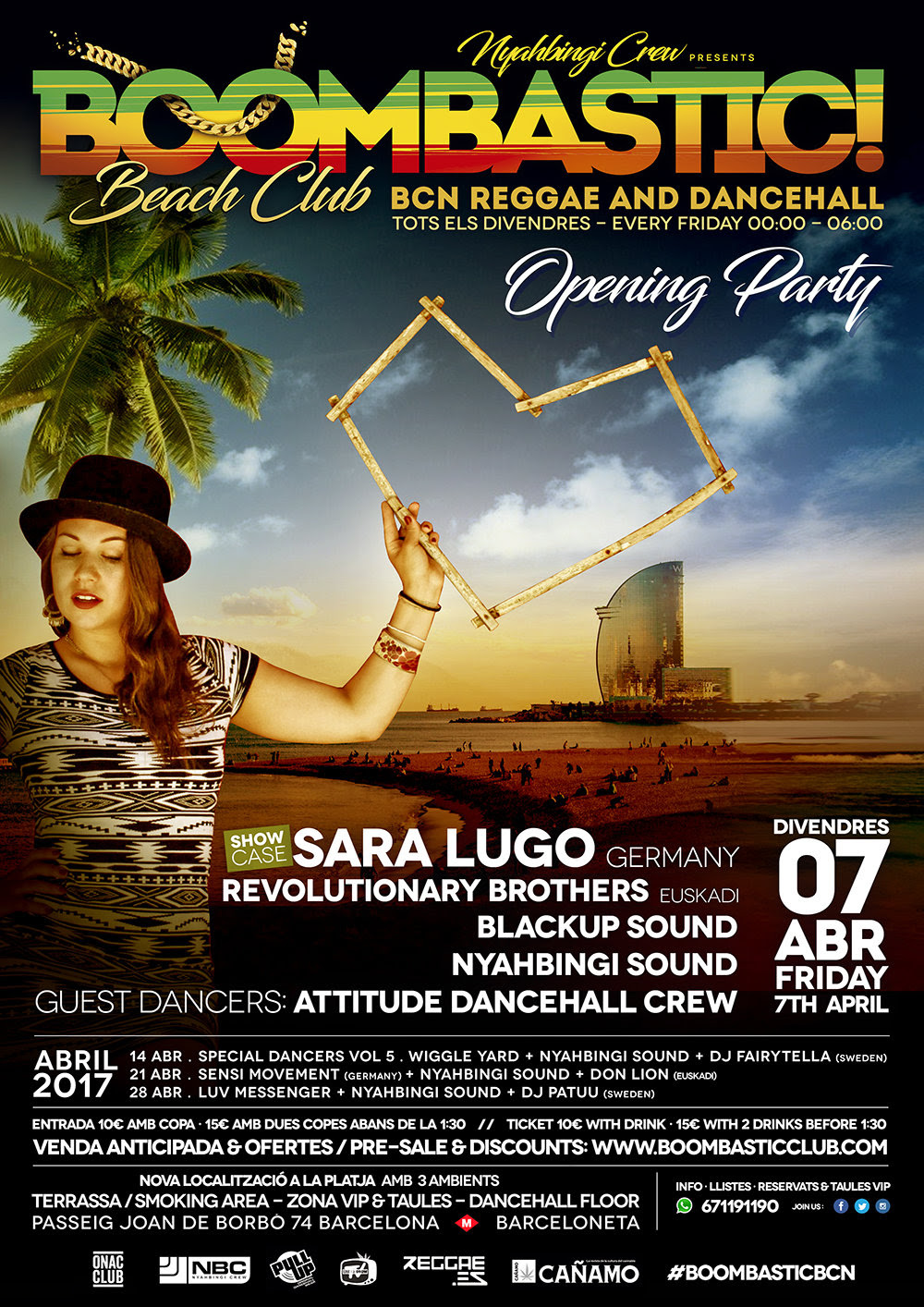 Para el estreno del nuevo espacio contarán con la cantante alemana Sara Lugo, Blackup Sound, Revolutionary Brothers, Nyahbingi Sound y la crew de baile Attitude Dancehall Crew. Programación completa y venta de entradas anticipadas en www.boombasticclub.com. Recuerda: el mejor dancehall y reggae todos los viernes de 00h a 06h! Get ready!