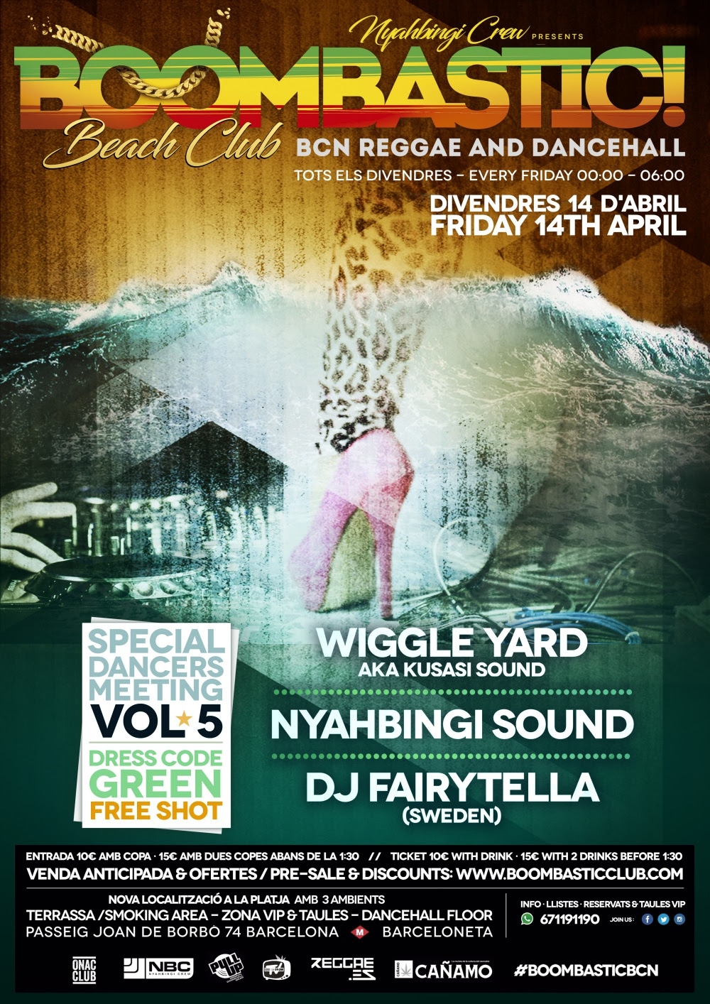 Tras el éxito de la inauguración del nuevo beach club el pasado viernes, esta semana dedicarán en BoomBastic Club nuestra fiesta mensual a la cultura del baile que más nos gusta! A dancehall ting! A los controles de la nave Wiggle Yard aka Kusasi Sound desde Esplugues de Llobregat, Dj Fairytella desde Suecia y los residentes Nyahbingi Sound desde Barcelona. Don’t miss it! Dress code verde: ven con una pieza de ropa complemento de este color y te regalarán un chupito! Programación completa y venta de entradas anticipadas en www.boombasticclub.com. Recuerda: el mejor dancehall y reggae todos los viernes de 00h a 06h! Best parties in town!
