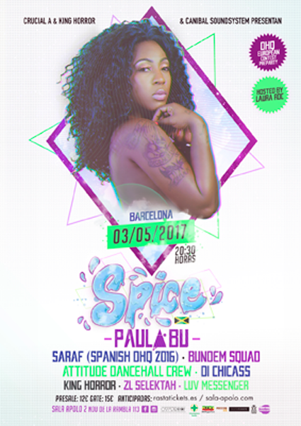 Crucial , King Horror & Canibal Sound System presentan por primera vez en Barcelona, desde Jamaica, llega una de las revoluciones actuales del Dancehall , Spice.