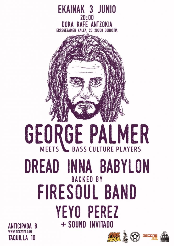 Si hablamos de voces dulces, melodías profundas y líricas conscientes, sin duda hablamos de artistas como George Palmer. Nacido en Donostia, Palmer es un artista que surge del extenso legado de música reggae y cultura sound system del Pais Vasco. Miembro de Hi-Fi y artista asociado a Fat Bird Recording, Palmer tiene algo que lo destaca; una voz inconfundible, una gran sensibilidad por la música y un gran talento al micrófono. Palmer ha participado en los más importantes festivales de Regge & Dub de Europa de los cuales se destacan Rototom, International Dub Gathering , La Concha Reggae Vibes, Telerama Dub e inumerables eventos y festivales. Entre sus trabajos por la península destacan producciones y colaboraciones con productores de la talla de Raggattack (Gerona), Supah Frans (Madrid), Eztandub (Bilbo), Dreadrive (Donosti) o Roots & Fyah (León), entre muchos otros.